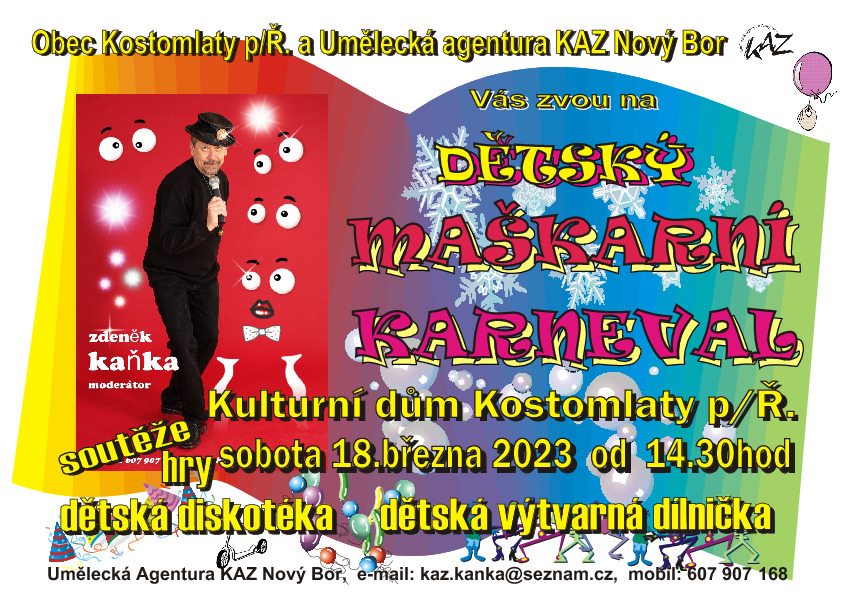 Obec Kostomlaty pod Řípem pořádá v sobotu 18. března 2023 od 14,30 h v místním kulturáku DĚTSKÝ KARNEVAL.