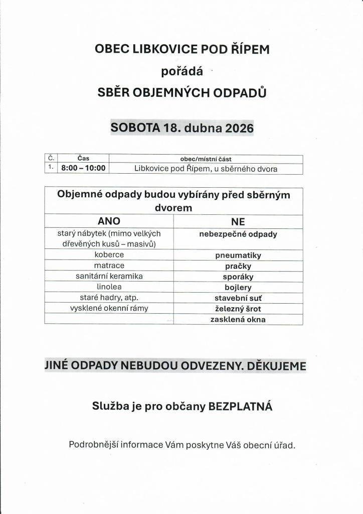 Dne 18.4. 2026 (sobota), proběhne sběr objemných odpadů. Mobilní sběrna bude přistavena u SBĚRNÉHO DVORA od 8:00 do 10:00. Více info - viz. přiložený leták.